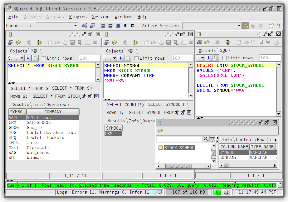 Through SQuirreL, you can issue SQL statements in the SQL tab (create tables, insert data, run queries), and inspect table metadata in the Object tab (for example, list tables, columns, primary keys, and types).